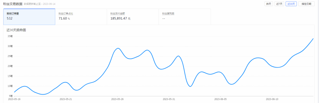 目前,粉絲訂單占比71.6%,粉絲復購率在5.33%左右。靠著耐心和細心,將售前與售后配合起來,店鋪在數據呈現上,減少了20%的售后率,也積攢了來之不易的口碑。