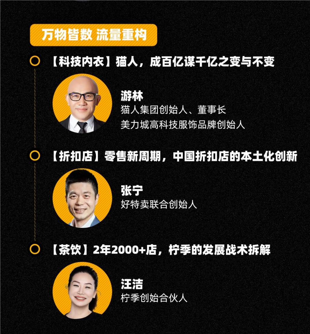 在“萬店連鎖·零售復(fù)興”維度,面向零售新時代,如何打破品牌增長瓶頸?紅杉中國合伙人蘇凱將帶來年度思考。同時,a1零食研究所創(chuàng)始人兼CEO周煒平、一知合伙人&首席運營官陳樂、白小T創(chuàng)始人張勇和三只羊集團(tuán)CEO杜剛等人,則通過零食、AI、服裝、直播等行業(yè)賽道分享零售復(fù)興之路。